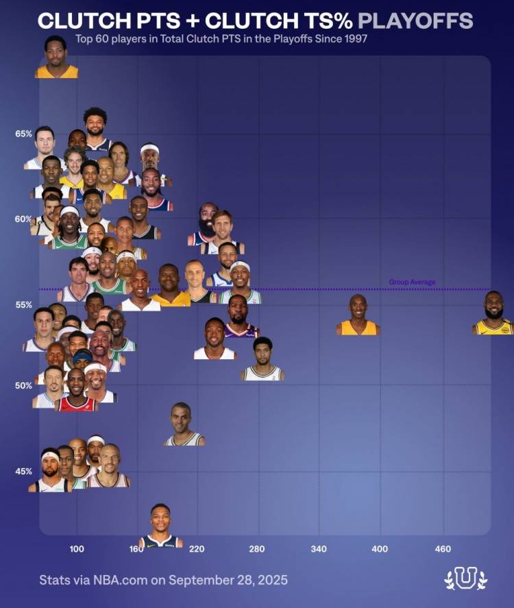 9月29日。有著名媒体NBA University统计并公布了从NBA官方有数据统计的1997年至今,在季后赛关键时刻(这有传统标准:最后5分钟分差在5分以内)得分表现(包括得分和效率)同期前六十的球员。其中詹姆斯是总得分王,而向来季后赛高端局和生死战拉胯的哈登,在一般的关键时刻效率比同样关键时刻拉胯的库里还高。