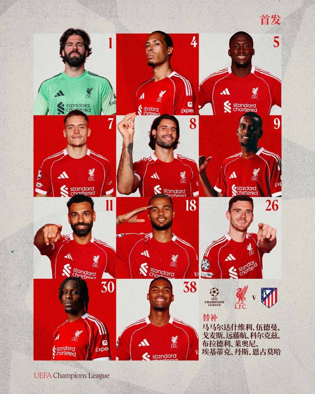 本场比赛阿利森担任首发门将,后防线上科纳特搭档范戴克,罗伯逊和弗林蓬分列左右,赫拉芬贝赫、维尔茨、索博斯洛伊坐镇中场,加克波、伊萨克、萨拉赫担任锋线。